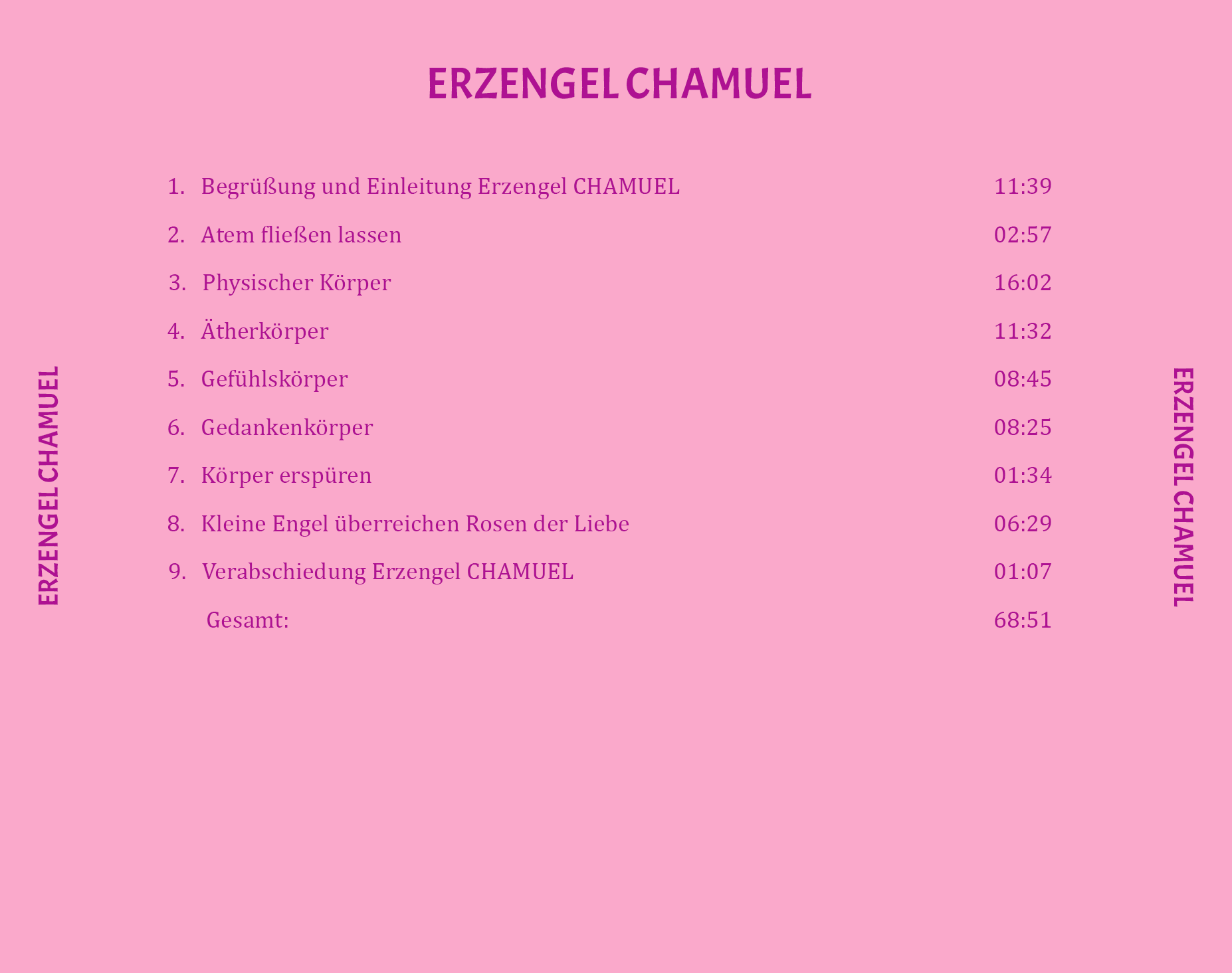 Erzengenl CHAMUEL führt mit uns eine umfassende Reinigung und Aufladung aller Körper mit der allumfassenden göttlichen Liebe durch. Im physischen Körper werden die Schatten aufgelöst, welche Krankheiten verursachen können, im Ätherkörper werden Narben und Verletzungen umgewandelt, im Gefühlskörper alle psychischen Belastungen ausgeglichen und im Denkkörper alle Unvollkommenheiten beseitigt, so dass das positive Denken wieder leichter fällt. Gemäss Erzengel CHAMUEL verläuft der Alltag dann wieder gelassener und harmonischer.