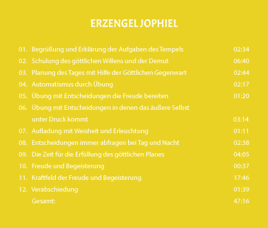 Erzengel JOPHIEL schenkt uns eine Übung für die Aufladung unserer Körper. Dabei verankert er in uns die Kräfte der Geduld, der Sanftmut, der Weisheit und Erleuchtung. Zusätzlich schenkt er uns die Kraft und Begeisterung für das Erkennens des göttlichen Willen und Planes, mit welchen wir bei regelmässiger Anwendung zunehmend unter der Führung unserer Gottgegenwart mit Freude und Begeisterung auf unserem weiteren Weg voranschreiten und die Vollkommenheit in unserem Leben verwirklichen können.